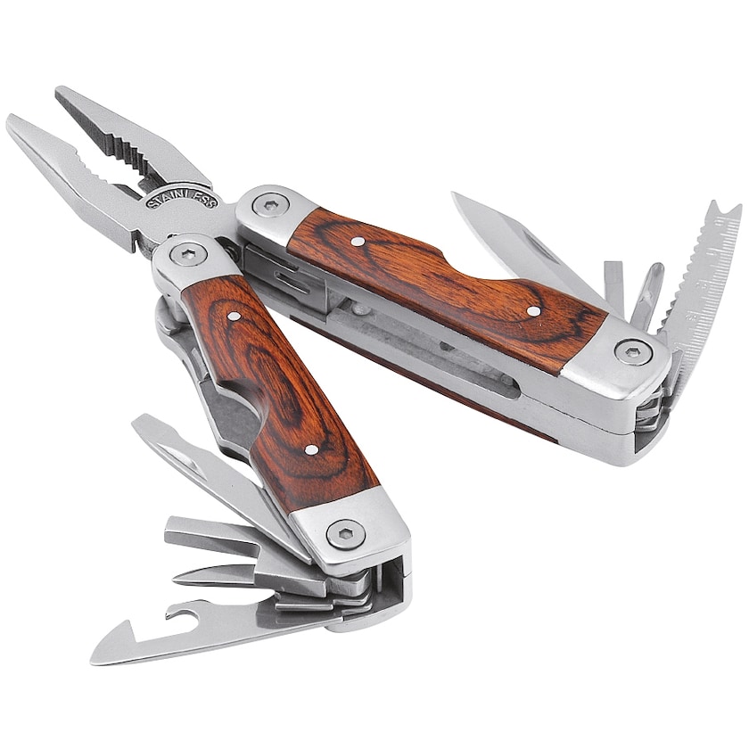 Outil multifonctions avec poignée garnie de bois de Pakka. Magnum possède un total de 22 fonctions et est livré avec étuis et pièces.