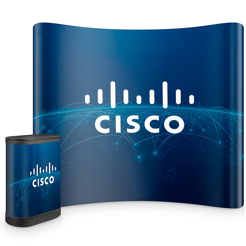 Set comportant un panneau-cloison Pop Up Medium, une table de stand et de l'éclairage. Le panneau-cloison a une élégante forme incurvée. Il peut être monté rapidement par une seule personne, aucun outil nécessaire. Le tissu est fixé par des bandes magnétiques. Le prix inclut l'impression sur le panneau-cloison et la table de stand. L'impression est réalisée sur la face avant et les deux côtés courts. La table de stand est équipée de roues et peut également servir de rangement.