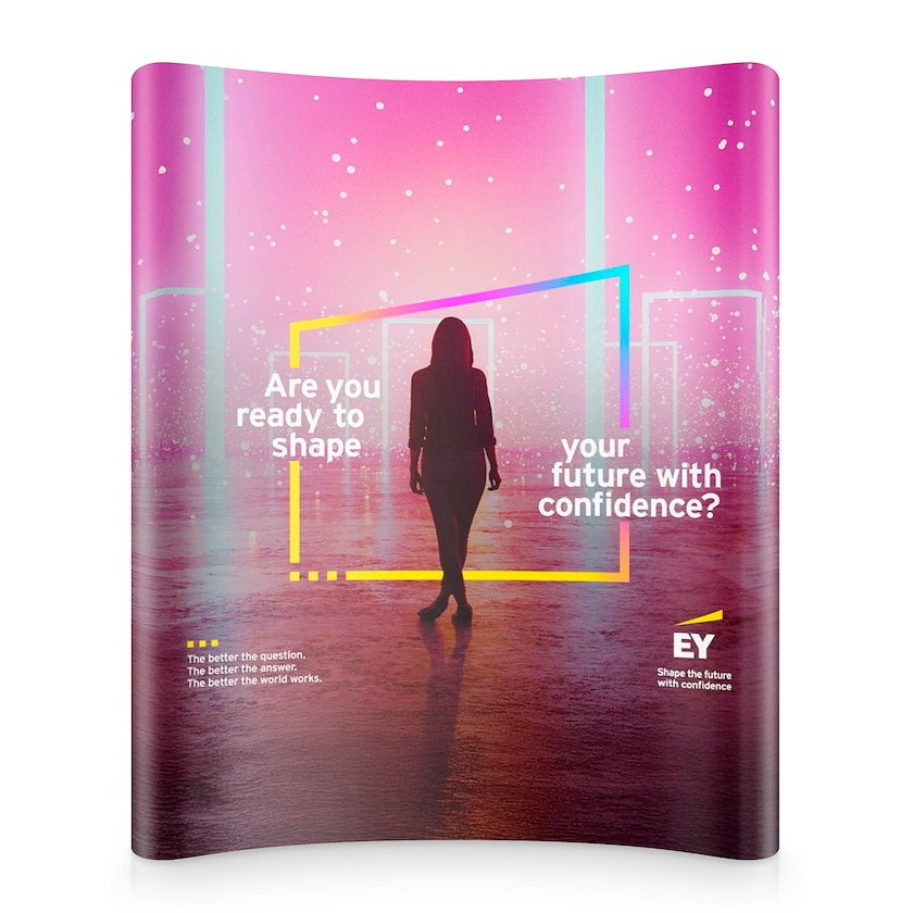 Petit panneau-cloison avec une jolie forme incurvée. Le panneau-cloison se monte en une seconde par une seule personne, aucun outil nécessaire. Le tissu est fixé par des bandes magnétiques. Livré dans une boîte de rangement pratique avec roues. L'impression est réalisée sur la face avant et les deux côtés courts.