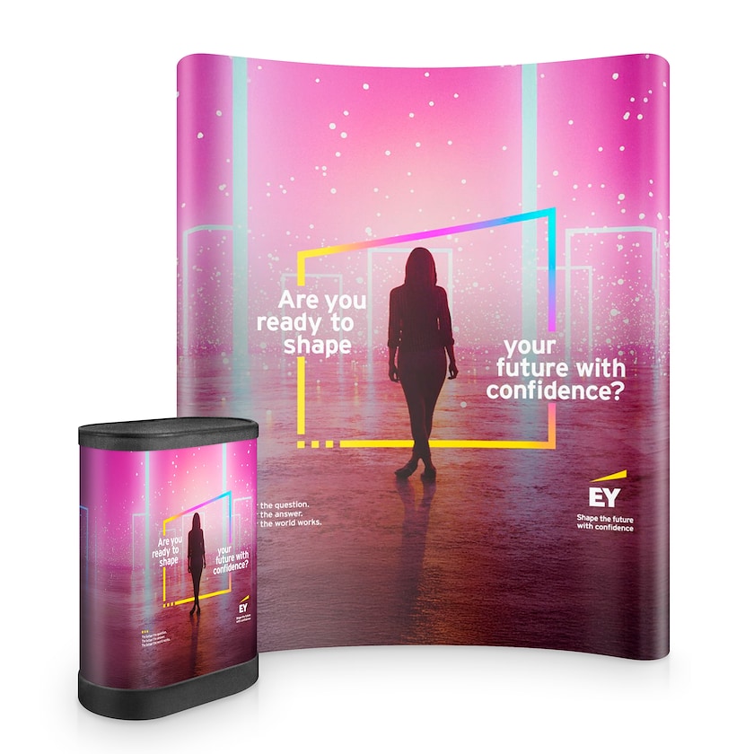 Set comportant un panneau-cloison Pop Up Small, une table de stand et de l'éclairage. Un ensemble qui s'adapte à la plupart des environnements et des besoins d'exposition. Le mur d'exposition mesure 200 cm de large et a une belle forme incurvée. Il peut être monté rapidement par une seule personne, aucun outil nécessaire. Le tissu est fixé par des bandes magnétiques. Le prix inclut l'impression sur le panneau-cloison et la table de stand. L'impression est réalisée sur la face avant et les deux côtés courts. La table de stand est équipée de roues et peut également servir de rangement.
