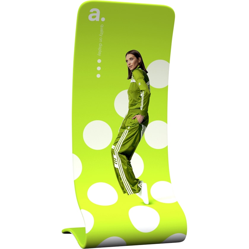 Mur d'exposition avec une forme en S envoutante. Le mur d'exposition est constitué d'une structure ingénieuse de tubes en aluminium assemblés en arc. L'assemblage se fait entièrement sans outils. Une fois le cerceau assemblé, tirez simplement le tissu dessus et fermez-le avec une fermeture éclair. Le tissu est imprimé avec de l'encre à base d'eau respectueuse de l'environnement sur le recto et le verso. Si nécessaire, le tissu peut être lavé en machine à 30 degrés. Si vous souhaitez modifier le motif à l'avenir, commandez simplement un nouveau tissu.