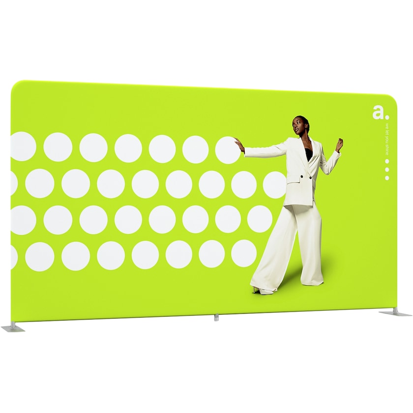 Mur d'exposition de 400 cm de large avec une construction intelligente. Le mur d’exposition est constitué de tubes d’aluminium assemblés en arceau. L'assemblage ne nécessite aucun outil. Le tissu, que nous fournissons avec votre impression, est ensuite drapé sur le cadre et fermé par une fermeture éclair. Le résultat est un mur beau et uniforme, sans faux plis. L'impression est réalisée avec une encre à base d'eau respectueuse de l'environnement sur les deux faces. Le tissu peut être lavé en machine à laver à une température de 30 degrés. Le tissu peut également être commandé séparément afin que les motifs puissent être remplacés.