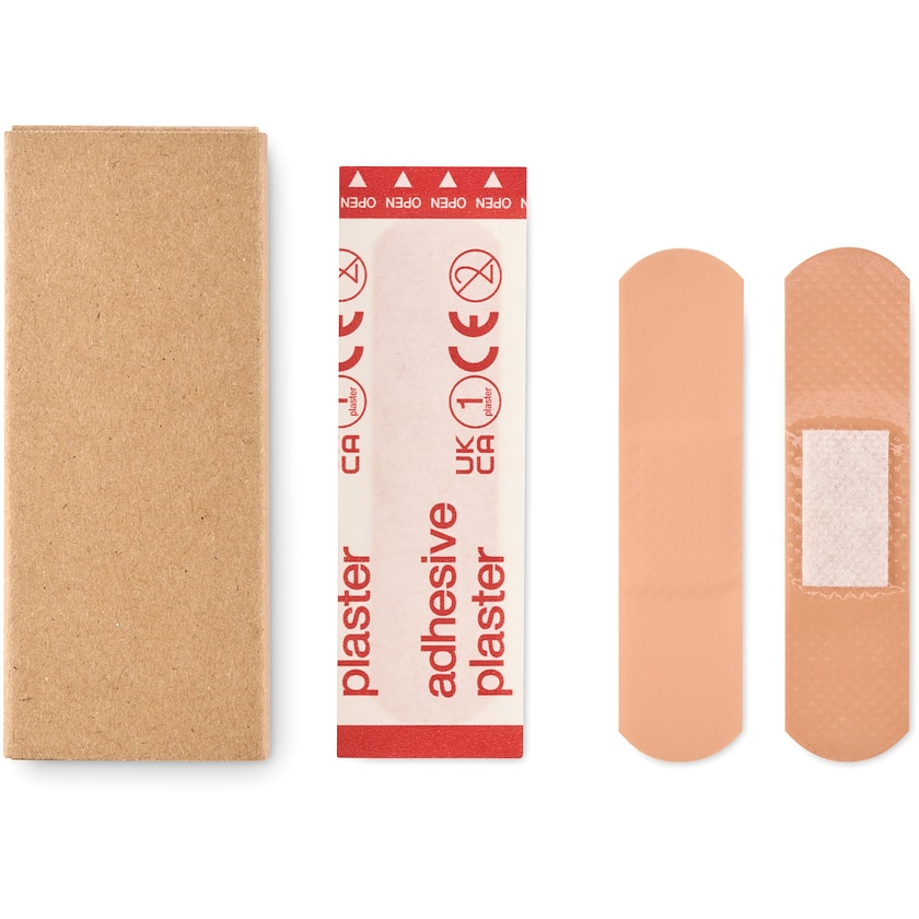 15 pansements dans une boîte en papier recyclé de couleur naturelle. L'impression est réalisée sur la boîte.