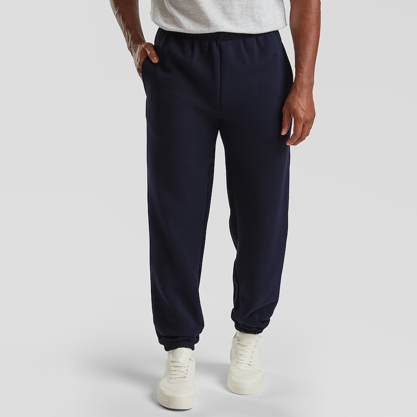 Pantalons de survêtements personnalisés haute qualité Fruit of the Loom. Ce modèle comporte une proportion de mélange de polyester plus importante que de normal, ce qui rend les pantalons plus résistants et leur permettent de supporter plus de lavages que les modèles standard. Les pantalons possède un serrage élastique aux chevilles. Livrés sous emballage plastique individuel. Également disponible en version modèle enfant.