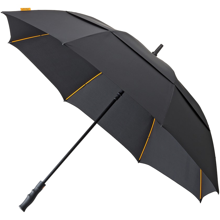 Parapluie de golf de haute qualité avec baleine et manche en fibres de verre. Le parapluie possède un système d'aération et une poignée caoutchoutée confortable. Livré dans un étui de rangement.