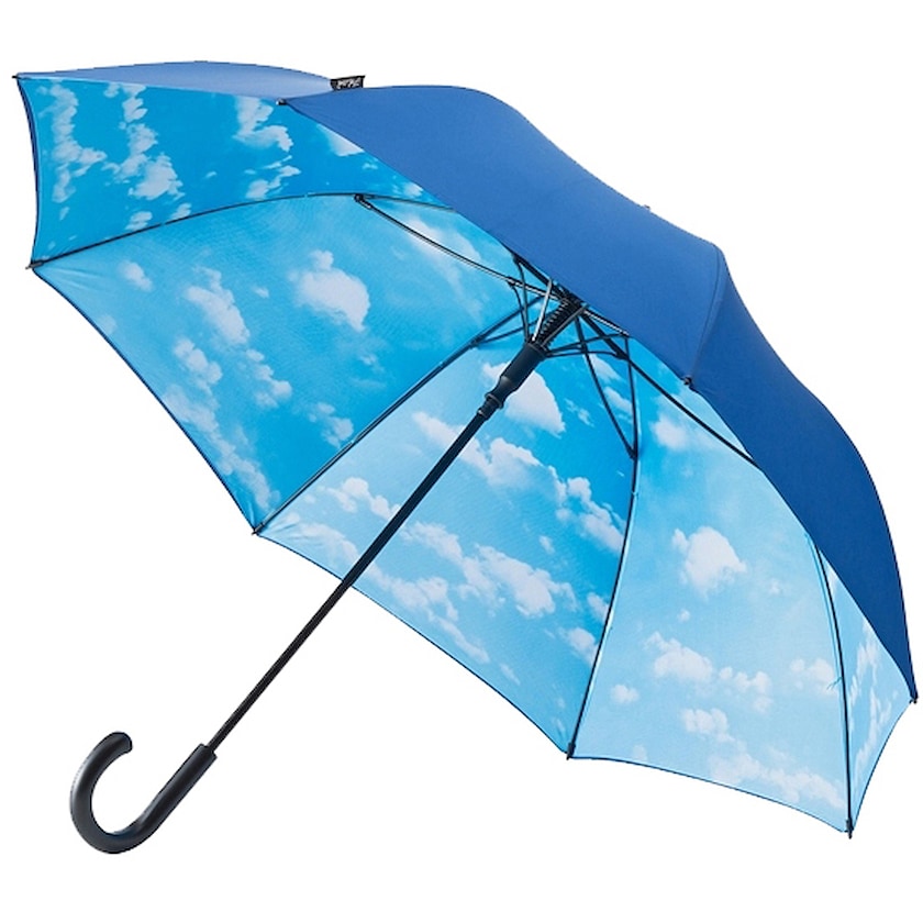 Grand parapluie de haute qualité avec motifs de nuage sur la surface intérieure. Le parapluie possède une armature en fibres de verres qui le rend très stable. La poignée est confortablement caoutchoutée.