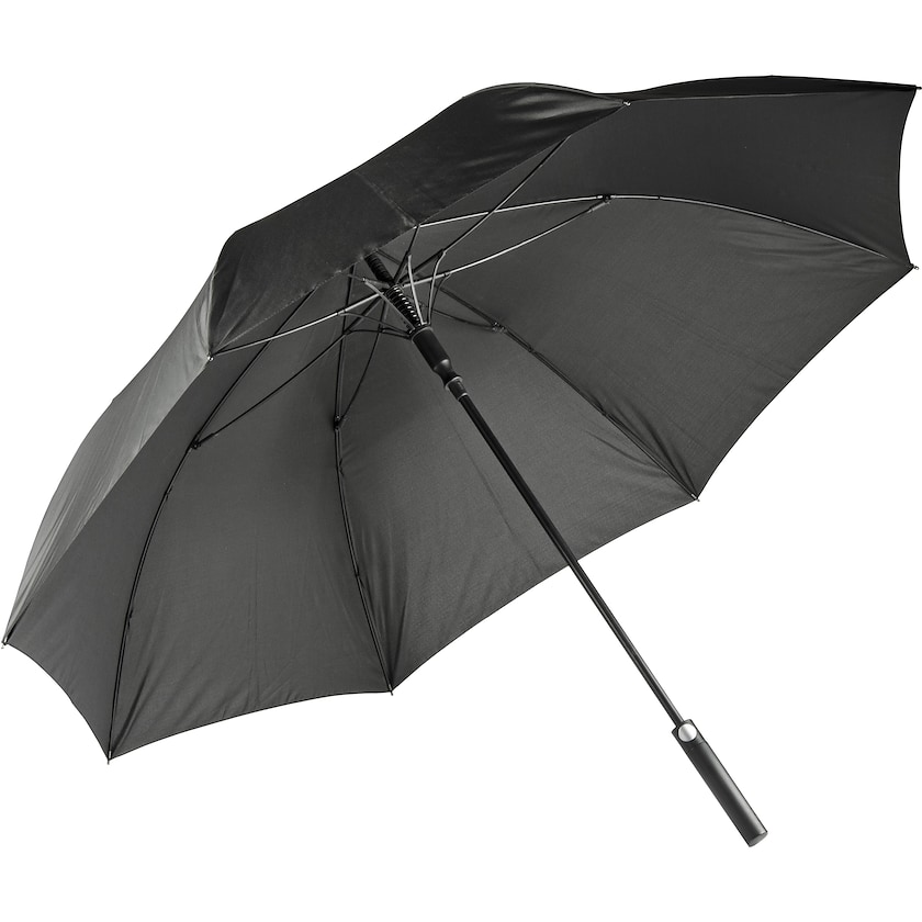 Grand parapluie de haute qualité avec poignée droite en bois. Ce parapluie possède une taille proche de celle d'un parapluie de golf. Il est fait en fibres de verre et est à ouverture automatique.
