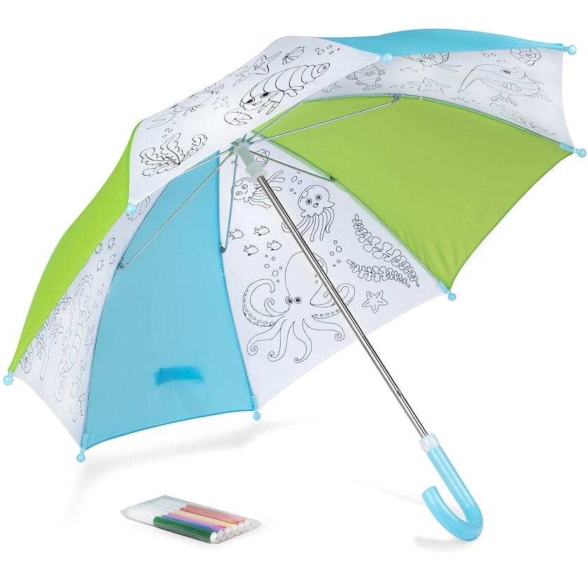Parapluie enfant sur lequel on peut dessiner. 6 crayons de couleur sont inclus. Le parapluie est à ouverture manuelle. Un objet publicitaire pour enfant à la fois pratique et fun !