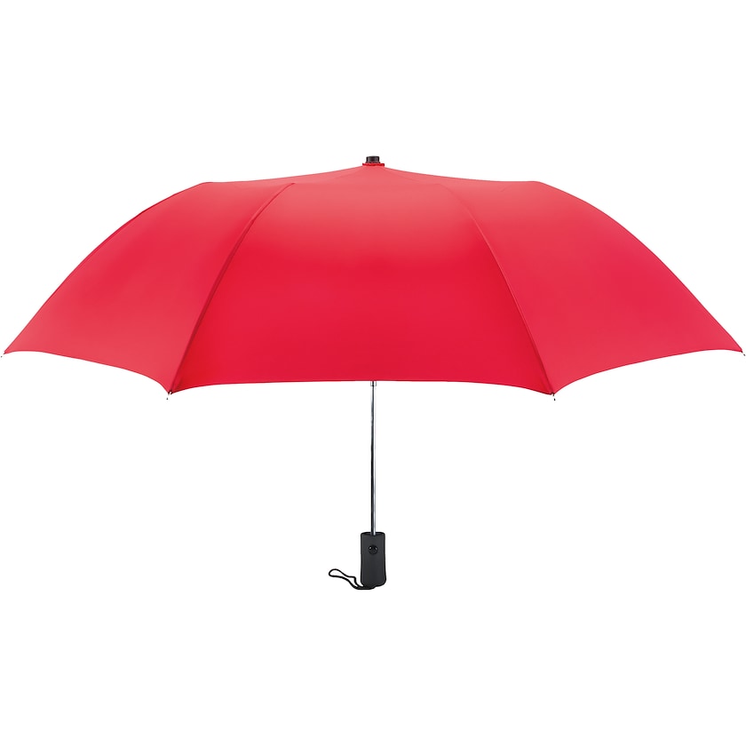 Parapluie pliable 2 sections disponible à partir de 10 unités. L'ouverture est automatique, la fermeture est manuelle. Les baleines et le manche sont en acier. La poignée est caoutchoutée.