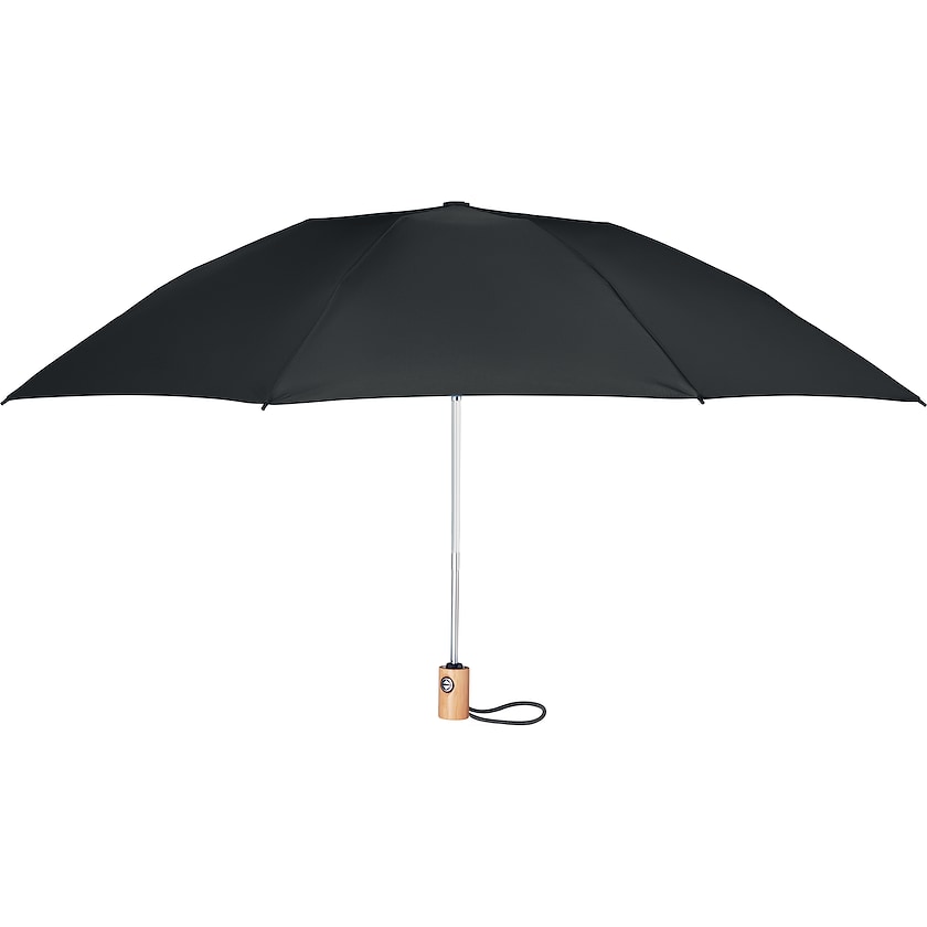 Parapluie pliable écologique personnalisé. Le parapluie est en rPET, c'est-à-dire en bouteilles PET recyclées. La poignée est en bambou, les baleines en fibres de verre résistantes. Le parapluie est à ouverture et fermeture automatiques.