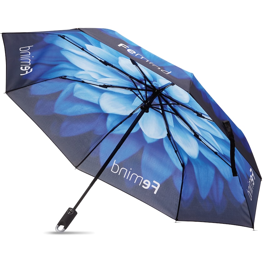 Parapluie pliable écologique avec un tissu personnalisé entièrement suivant vos souhaits. Le Ravenna possède une poignée unique qui permet de l'accrocher à un sac à dos ou à une valise, par exemple. Le parapluie a trois section et une armature renforcée avec des baleines en fibres de verre. Ouverture et fermeture automatiques. L'intégralité du tissu est personnalisé suivant vos souhaits, puis cousu sur l'armature du parapluie. Livré avec un étui assorti au design du parapluie. Le tissu est fabriqué en rPET, c'est-à-dire en bouteilles PET recyclées.