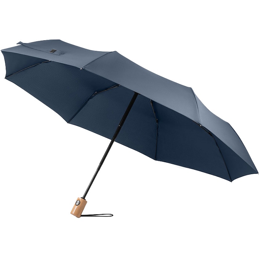 Parapluie compact écologique personnalisable. Le tissu est en rPET, c'est-à-dire fabriqué à partir de bouteilles PET recyclées. Les baleines sont en fibres de verre, la poignée en bois. L'ouverture et la fermeture sont automatiques.