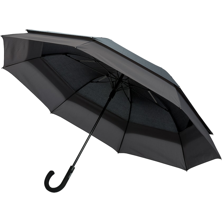 Parapluie de haute qualité résistant aux tempêtes. Les baleines sont en fibre de verre et le mât du parapluie est en métal. La toile est en polyester recyclé. Une fois plié, le parapluie est très compact. Il s'ouvre automatiquement et se ferme manuellement.