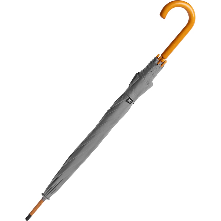 Parapluie dont la toile est fabriquée à partir de matériaux recyclés. Jamestown est un parapluie avec des baleines en métal et une poignée en bois. Le tissu est fabriqué à partir de rPET, c'est-à-dire de bouteilles PET recyclées. Une étiquette en tissu indique qu'il est fabriqué à partir de rPET.