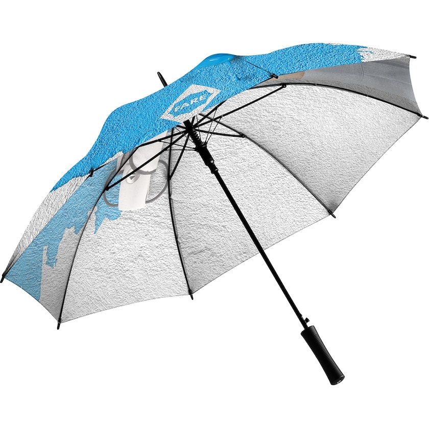Parapluie de haute qualité avec personnalisation intégrale du tissu. Ce parapluie possède une armature renforcée pouvant résister à de puissantes rafales. Ses baleines sont en fibres de verre, son manche en acier noir galvanisé. L'intégralité de la surface supérieure du tissu est personnalisable suivant vos souhaits. Le délai de livraison est long, car les parapluies sont fabriqués directement à l'usine sur commande.