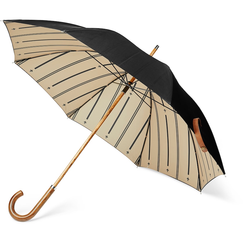 Parapluie de haute qualité au design élégant. Le tissu est fabriqué à partir de PET recyclé et possède une doublure intérieure au design élégant. Les baleines sont en fibre de verre et le manche est en bois composite durable.