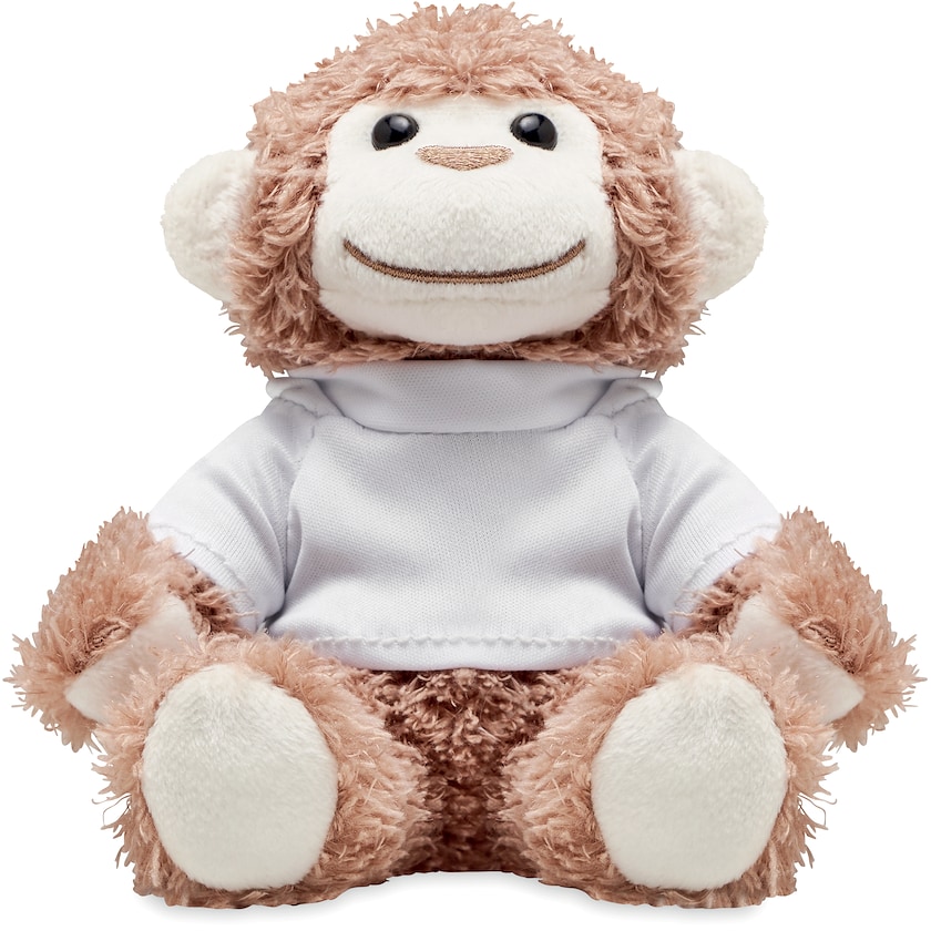 Un adorable singe joyeux sur un hoodie blanc. La personnalisation est réalisée sur le hoodie.