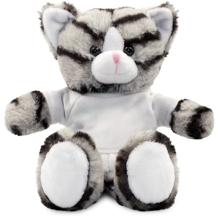 Adorable petit chat avec T-shirt personnalisable. La peluche fait 16 cm de haut. Le T-shirt est livré séparément. Commandez vos chats en peluche personnalisés!