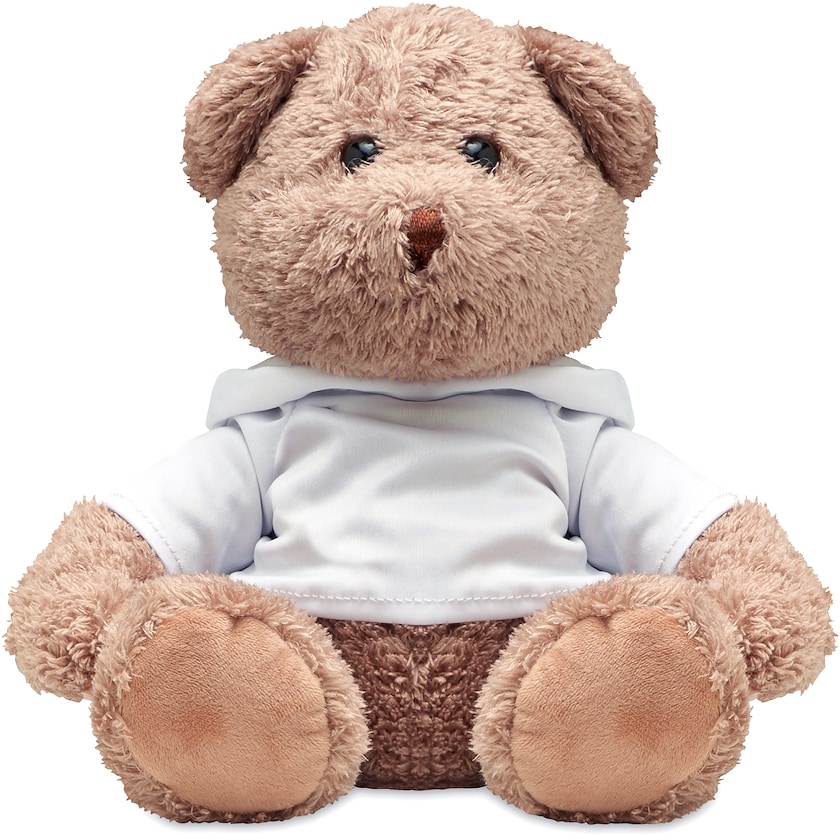 Grand ours en peluche avec un hoodie blanc. La personnalisation est réalisée sur le hoodie.