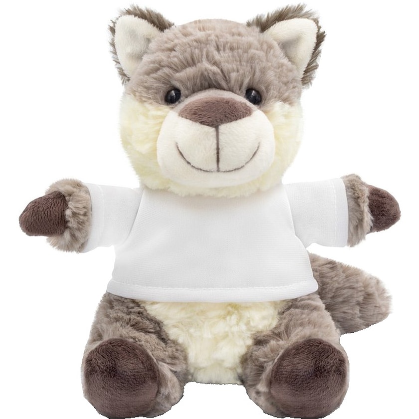 Doudou en forme de loup tout mignon. L'impression se fait sur le t-shirt (emballé séparément de la peluche).