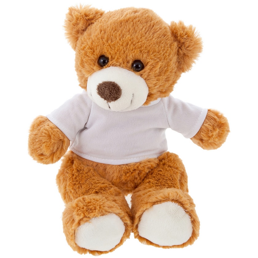 Ours en peluche heureux avec T-shirt blanc. L'impression est effectuée sur le T-shirt de l'ours en peluche. Le T-shirt est livré séparément de l'ours en peluche. Un ours en peluche joyeux qui répand la joie!