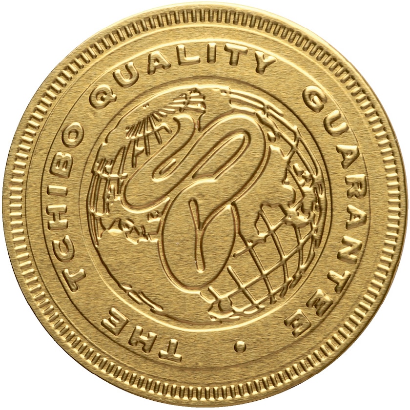 Pièces en chocolat avec logo estampillé sur le papier d'emballage. La pièce en chocolat possède un diamètre de 38 mm et l'estampe est effectué sur le papier d'emballage.