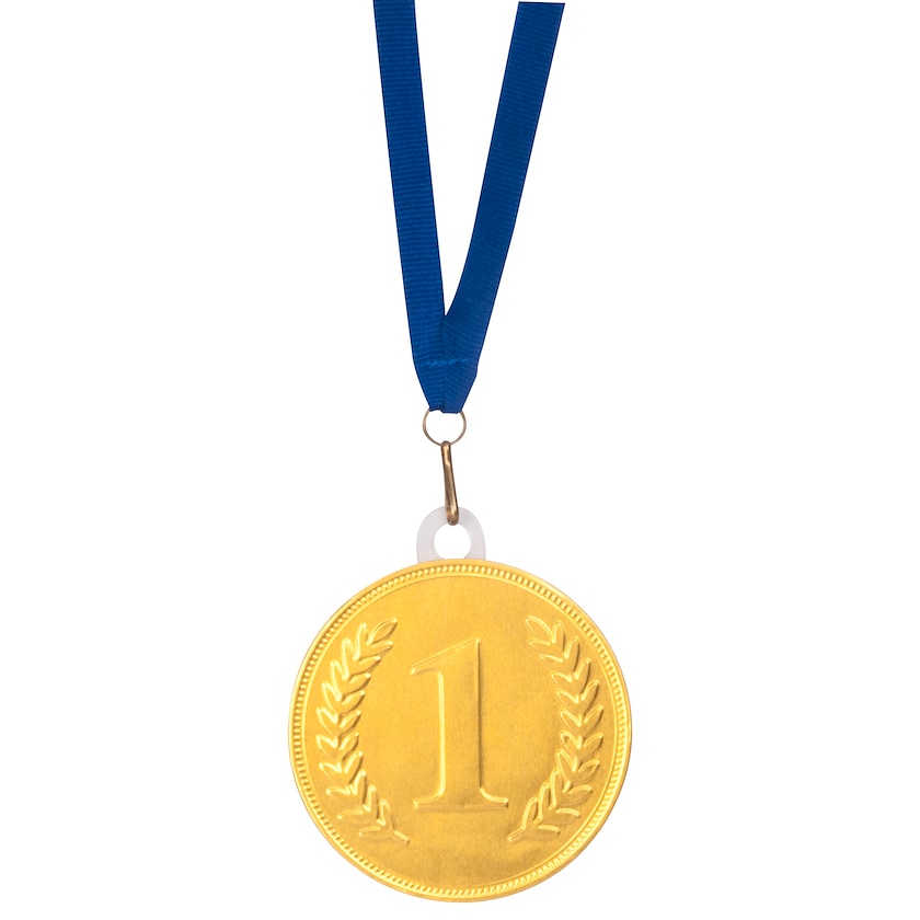 Médaille en chocolat avec papier d'aluminium doré avec un chiffre "un" embossé. La médaille en chocolat est accrochée à un cordon bleu de sorte qu'elle puisse être passée au cou d'un·e gagnant·e. Contient du chocolat au lait avec une teneur en chocolat minimum de 28%. Grâce au fait que les médailles en chocolat sont déjà en stock, les délais de livraison sont courts. Aucune personnalisation ou embossage supplémentaire n'est possible.
