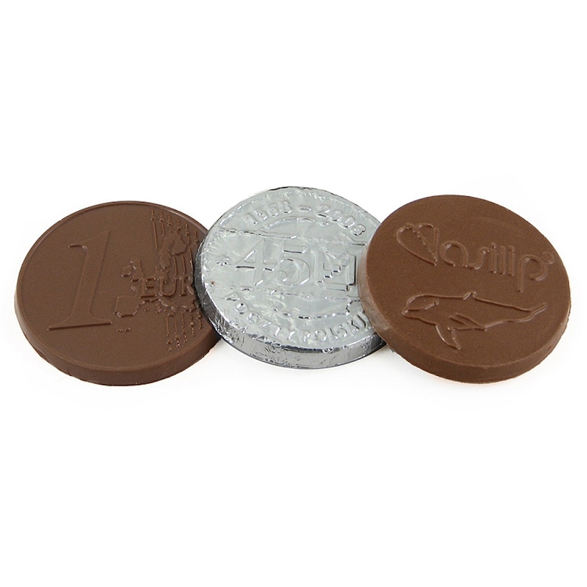 Grande pièce en chocolat avec votre logo estampillé directement dans le chocolat. Les pièces sont fabriquées dans le plus fin des chocolats belges. Choisissez entre un feuillet argenté ou doré.