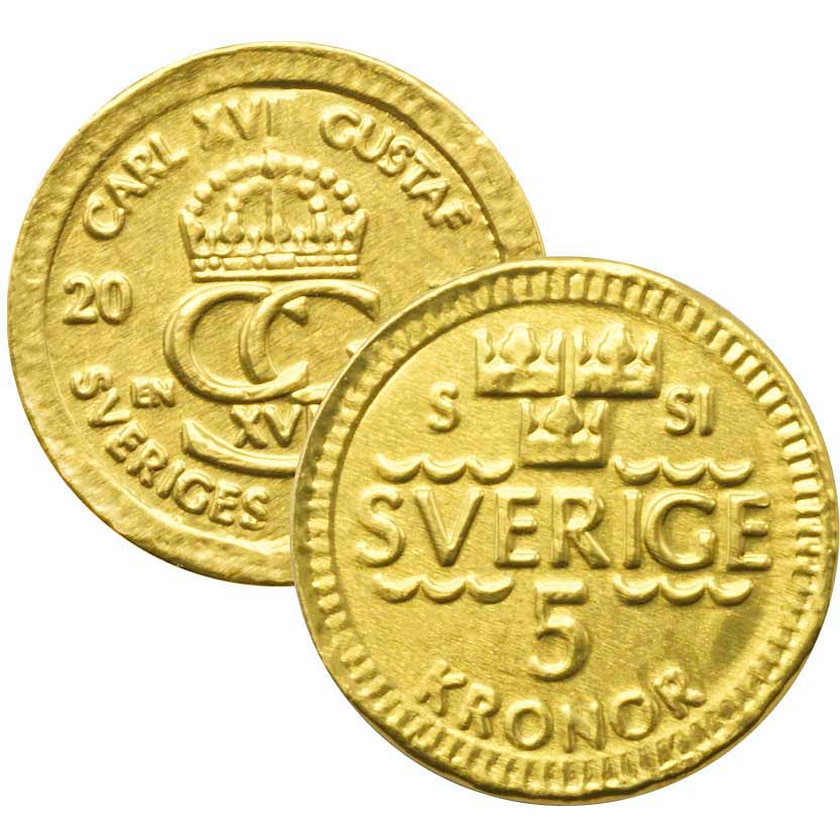 Pièce en chocolat en forme de pièce de cinq couronnes suédoises. Le chocolat à la menthe est fabriqué à partir d'un délicieux chocolat au lait avec une teneur minimale en cacao de 28 %.