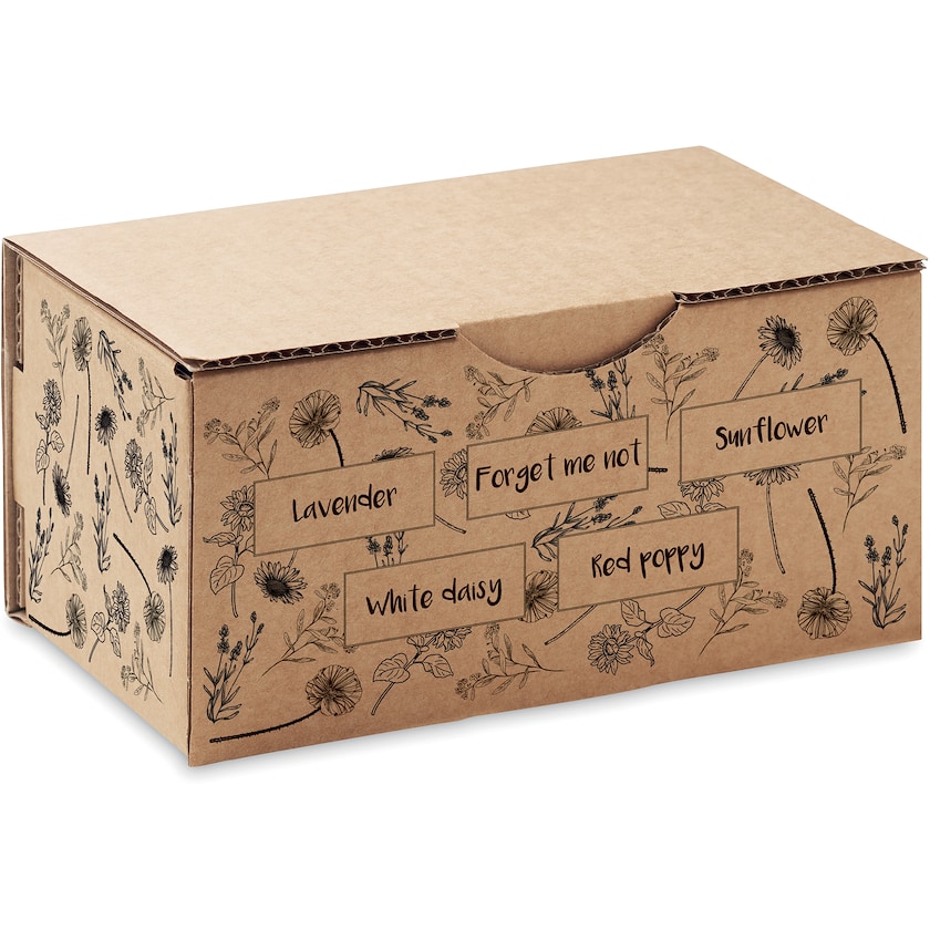 Kit de culture pour cinq fleurs. Il s'agit de fleurs de lavande, myosotis, tournesol, marguerite et coquelicot. Le kit est fabriqué dans l'UE. La personnalisation est réalisée sur le couvercle du carton.