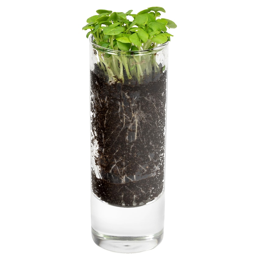 Verre avec motte de terre livré dans un emballage en carton avec imprimé personnalisé. Le verre est de haute qualité et permet au jardinier de pouvoir monitorer le développement de sa plante. Parfait pour le bureau!