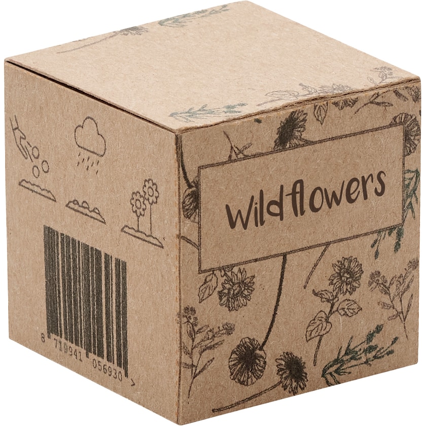 Balle végétale contenant des graines de fleurs sauvages. Livrée dans une boîte couleur nature personnalisée. Fabriquée dans l'UE.