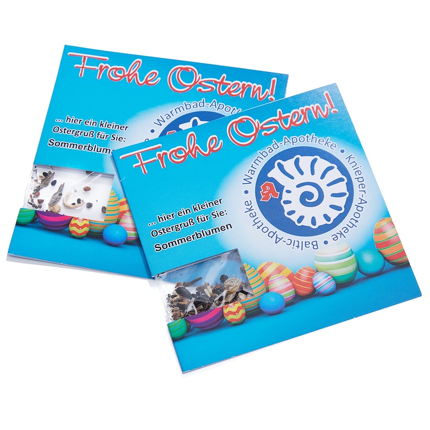Carte de graines innovante avec des encarts montrant les graines choisies. Appréciée de tous les clients! Disponible avec des graines de tournesol, des fleurs estivales, des soucis, des marguerites, du basilic ou du cresson.