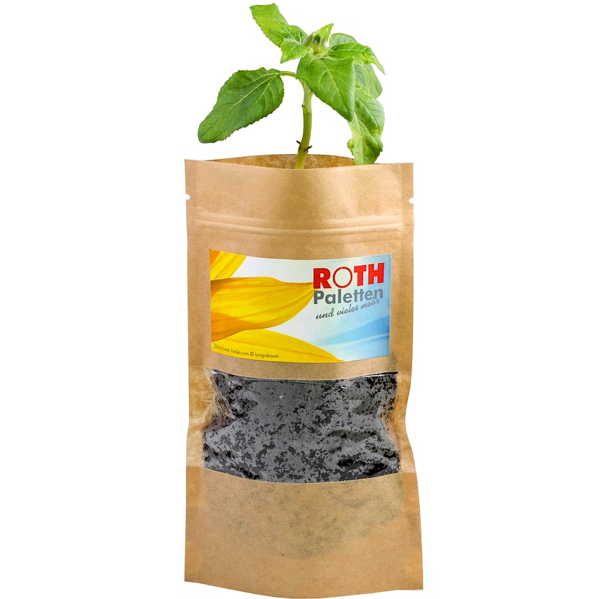 Faites-la pousser directement dans son sachet! Le kit comprend un sachet, des graines, une motte de terre et les instructions. Plantez les graines et regardez grandir votre plante à travers l'encart du sachet. Bientôt, elle en dépassera! Une étiquette imprimée en 4 couleurs suivant vos souhaits est apposée au sachet.