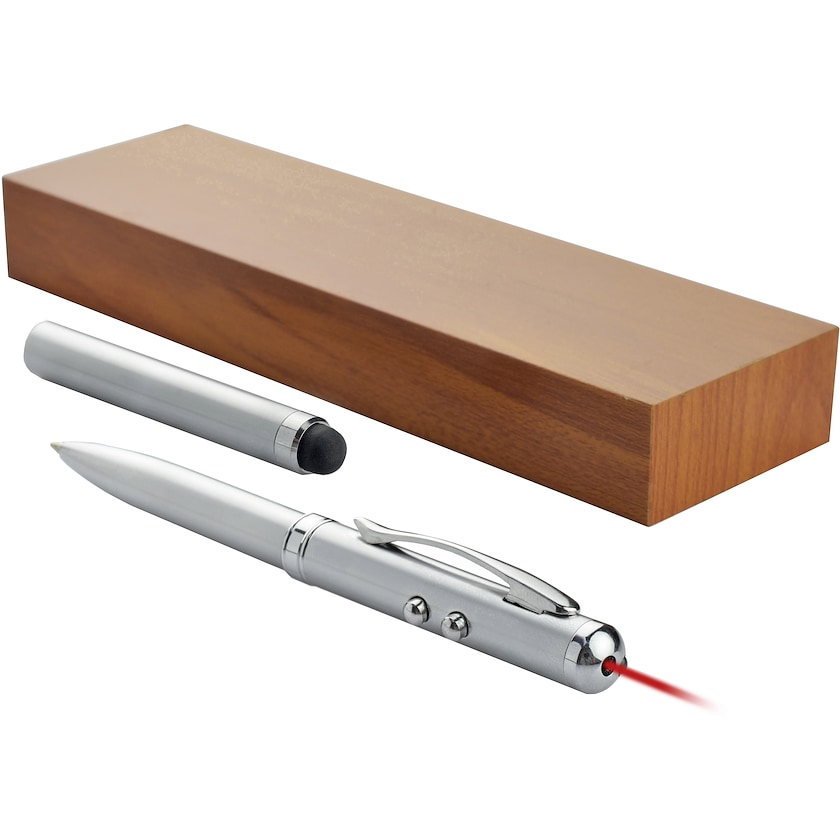 Pointeur laser avec stylo bille, stylet et lampe de poche dans une élégante boîte en bois. La personnalisation est effectuée par gravure laser sur le pointeur laser. Le pointeur laser est équipé d'une étiquette d'avertissement en accord avec la directive EU 2006/25/EU.
