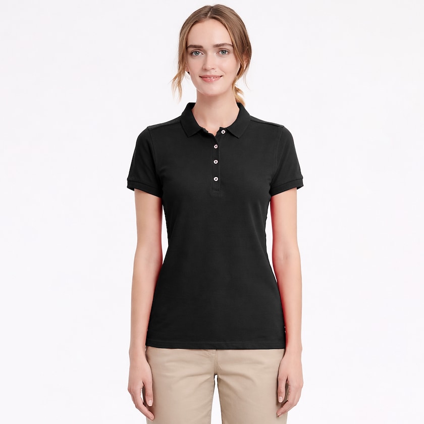 Polo slim pour femme en tissu stretch. Le tissu contient 5% de lycra, ce qui le rend extrêmement souple et agréable. Les polos sont livrés sous emballage plastique individuel. Également disponible en version version homme.