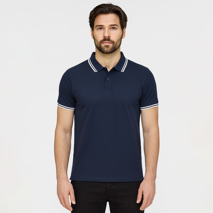 Polo homme avec bandes de couleur contrastante sur le col et aux extrémités des manches. Le polo est 100% coton. Les boutons sont joliment assortis à la couleur du polo. La quantité minimum de commande est de seulement 5 unités.