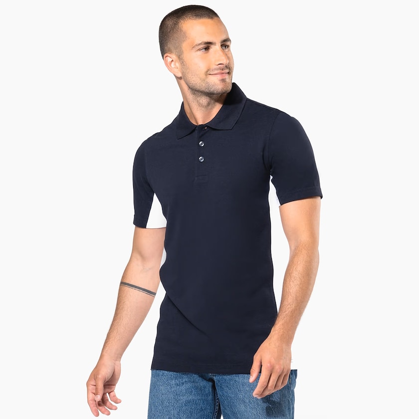 Polo sport avec manches et côtés de couleur contrastante. Les T-shirts sont livrés sous emballage plastique individuel.
