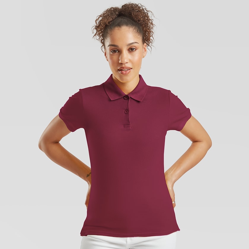 Polo moulant modèle femme Fruit of the Loop. Le FOTL Lady-Fit Premium Polo est fabriqué en 100% coton d'une épaisseur de 180g/m². Livré sous emballage plastique individuel. Également disponible en version version homme.