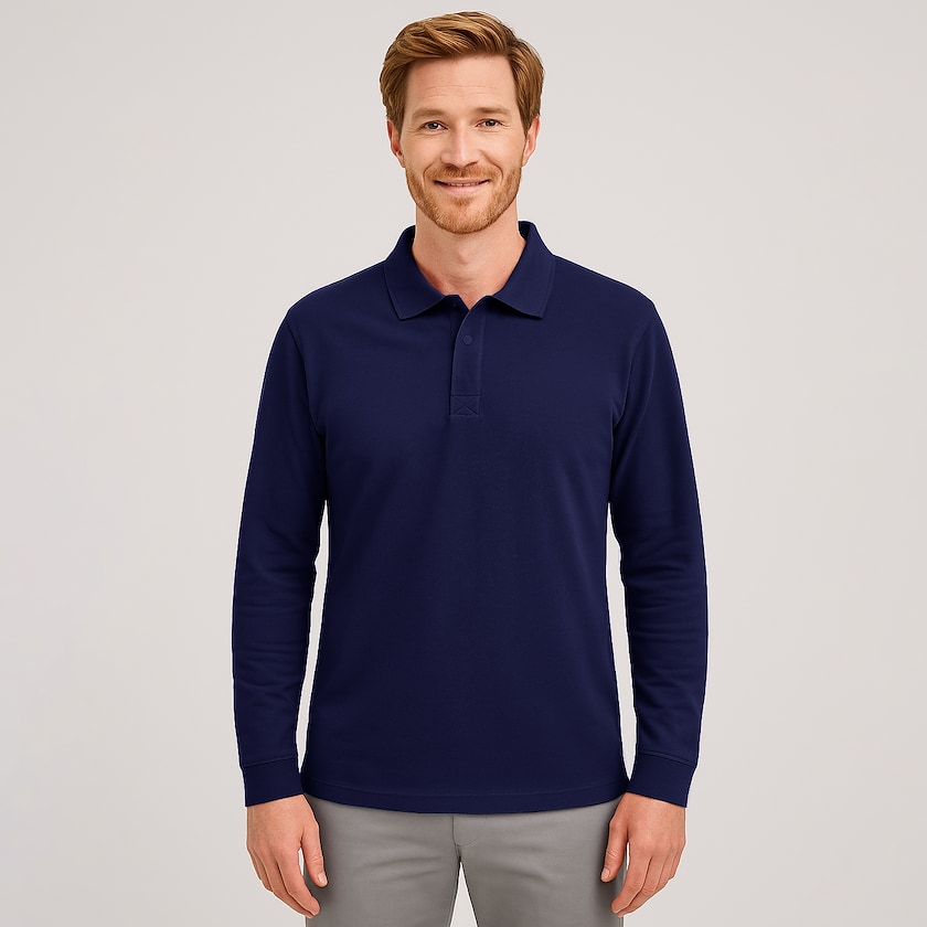 Polo personnalisé à manches longues pour homme. Le polo est fabriqué dans une toile de coton de 200 grammes d'épaisseur. Le col se ferme par deux boutons aux couleurs assorties. Également disponible en version version femme.