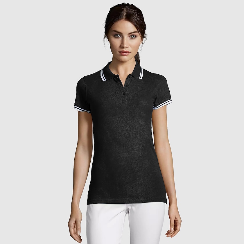 Polo pour dames avec des rayures sur le col et les manches. Le polo a une coupe moderne et est fabriqué dans un tissu de coton de 200 grammes certifié OEKO-TEX. Le col du polo est doté de trois boutons. Un classique intemporel ! Également disponible en version version homme.