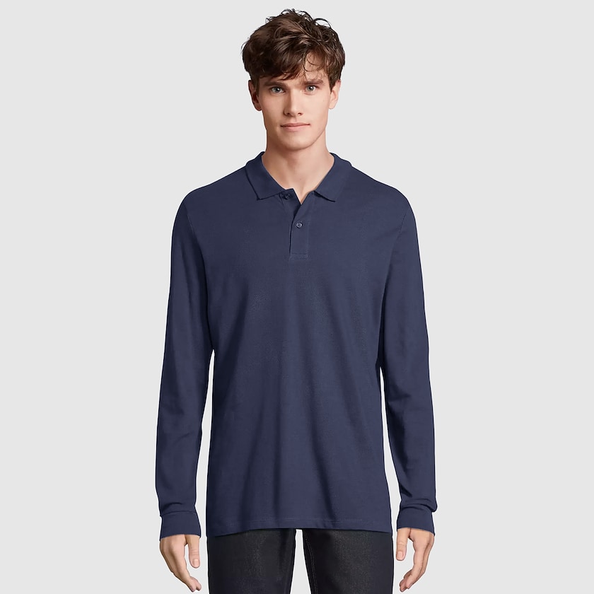 Polo avec impression à manches longues pour hommes. Le polo est fabriqué en 180 grammes de coton certifié ÖKO-TEX. Le col est muni de deux boutons assortis à la couleur du tissu. Le marquage peut être imprimé ou brodé. Également disponible en version version femme.