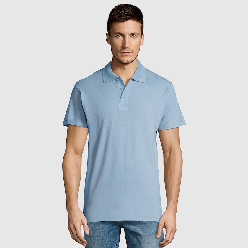 Polo homme personnalisé en toile de coton 170 grammes. Ce polo possède une coupe moderne avec trois boutons ton-sur-ton au niveau du col. Le tissu est certifié OEKO-TEX. Également disponible en version version femme.