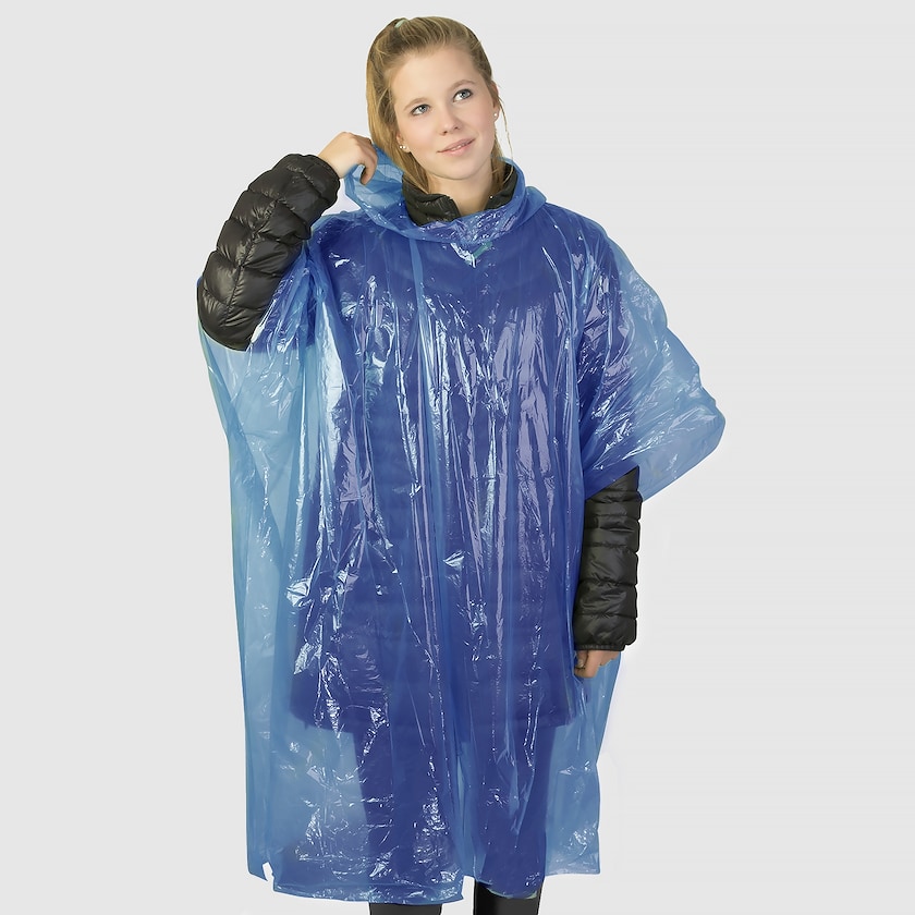 Poncho de pluie à capuche livré dans un emballage plastique. Disponible en plusieurs jolis coloris. La personnalisation est effectuée via une étiquette imprimée en 4 couleurs et placée dans le sachet.
