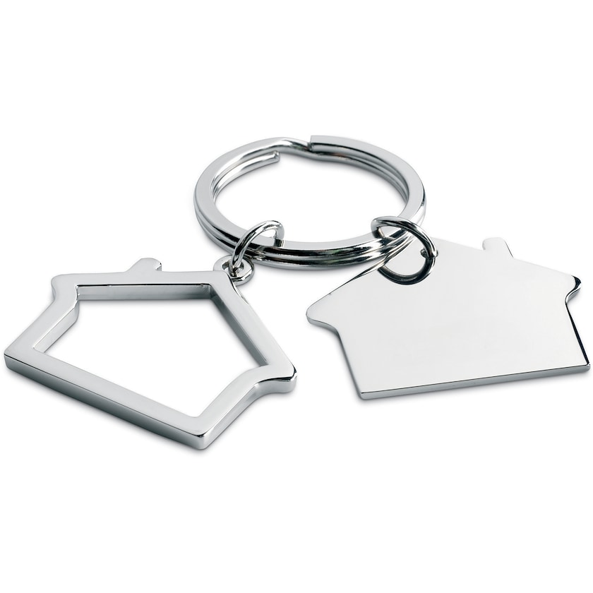 Porte-clé en métal en forme de maison. Le porte-clé est livré dans une boîte cadeau noire.