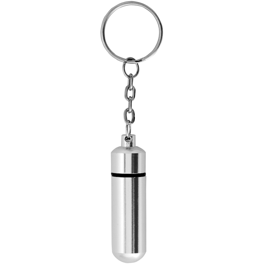 Porte-clé avec petite boîte à pilules en aluminium. Boîte à pilules maligne accrochable à son porte-clé. La personnalisation est effectuée par gravure laser.
