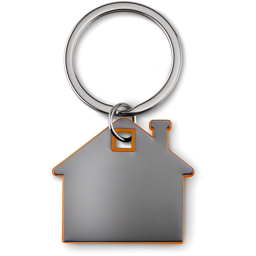 Porte-clé en forme de maison en plastique et acier inoxydable. Parfait pour une agence immobilière. La personnalisation est réalisée soit par impression monochrome, soit par gravure laser.
