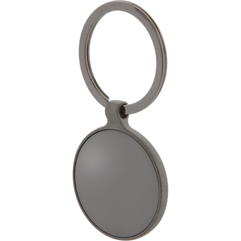 Porte-clés rond en métal finition gun metal. Les deux plaques sont brillantes et le reste du porte-clés est mat. Le marquage se fait par gravure laser. Le porte-clés est livré dans une boîte cadeau noire.