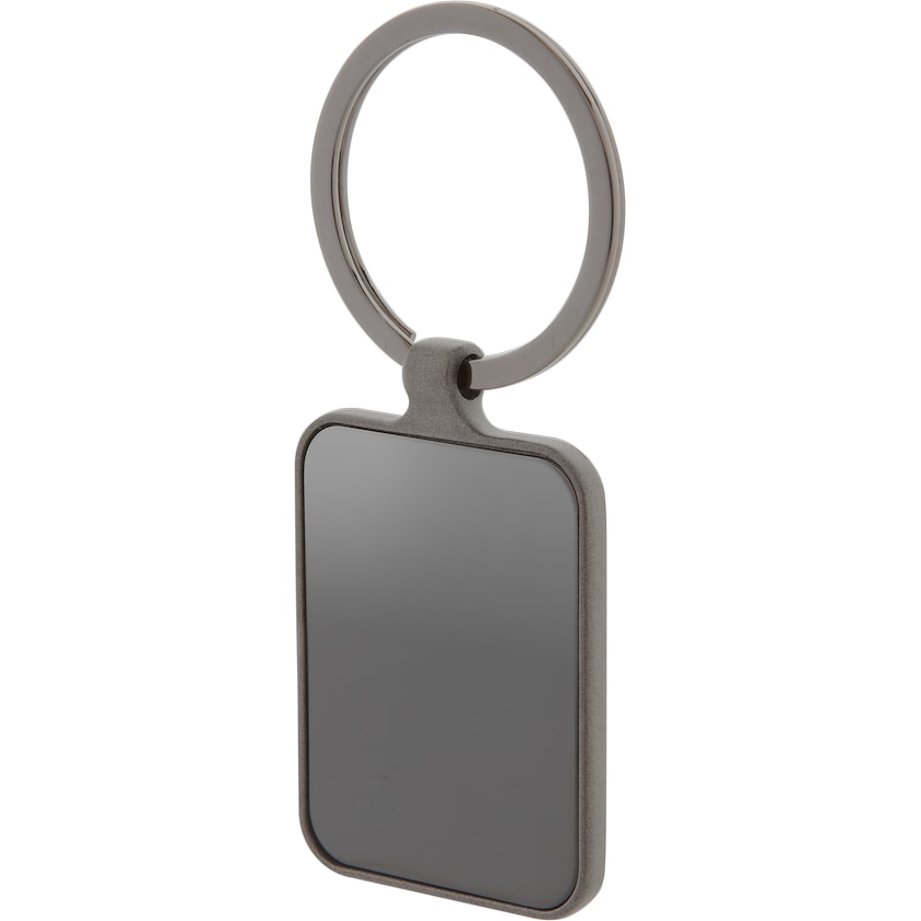 Porte-clés rectangulaire en métal finition gun metal. Les deux plaques sont brillantes et le reste du porte-clés est mat. Livré dans un coffret cadeau noir.