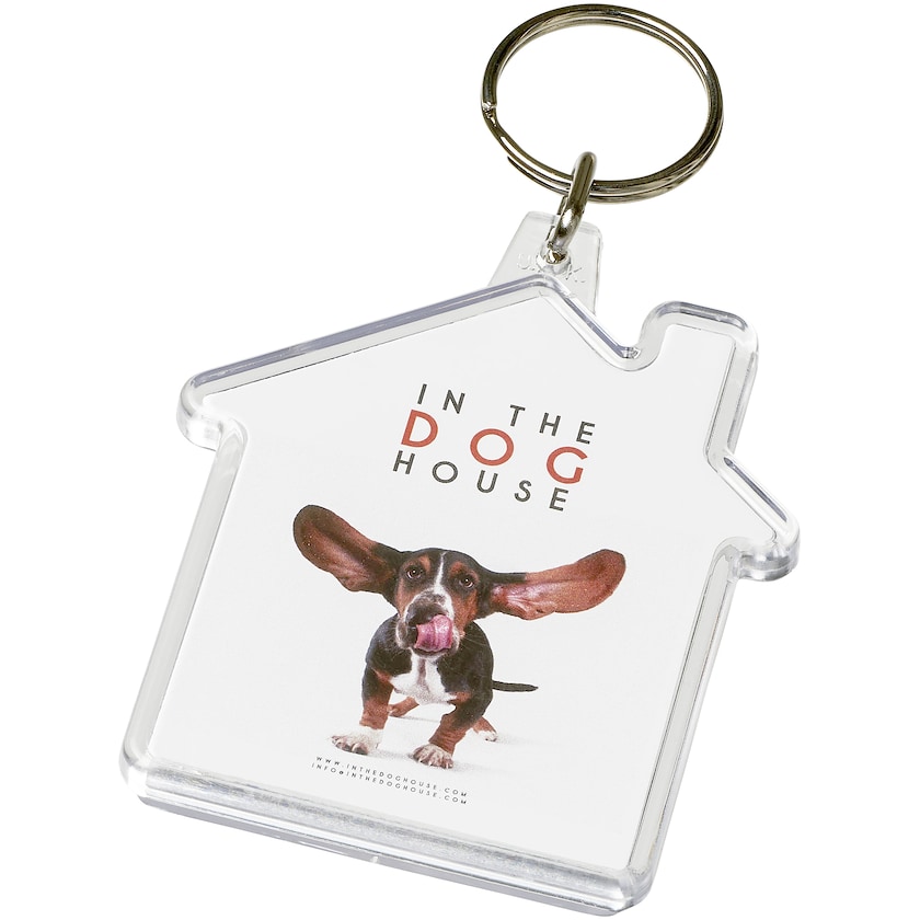 Porte-clés personnalisable écologique en forme de maison. Le Madden est fabriqué dans le matériau écologique GPPS. La personnalisation est réalisée des deux côtés d'un papier inséré dans la coque en GPPS. Les motifs peuvent être différents des deux côtés du papier. Le porte-clés est fabriqué en Europe.